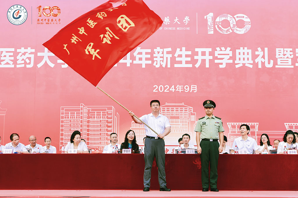 2024年开学典礼上,陈文锋书记为军训团授旗,并宣布2024级新生军训开训