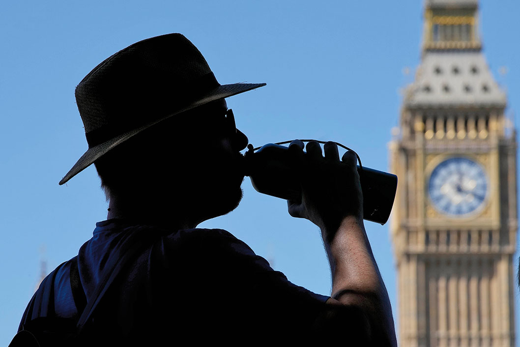 2022年8月11日,在英国伦敦,喝饮料的游客经过“大本钟”