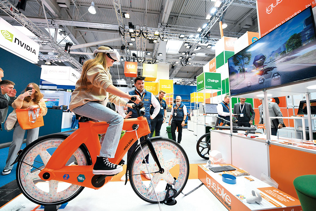 2023年4月20日,在德国汉诺威工博会上,参观者骑在一款由回收塑料制成的自行车上体验VR游戏