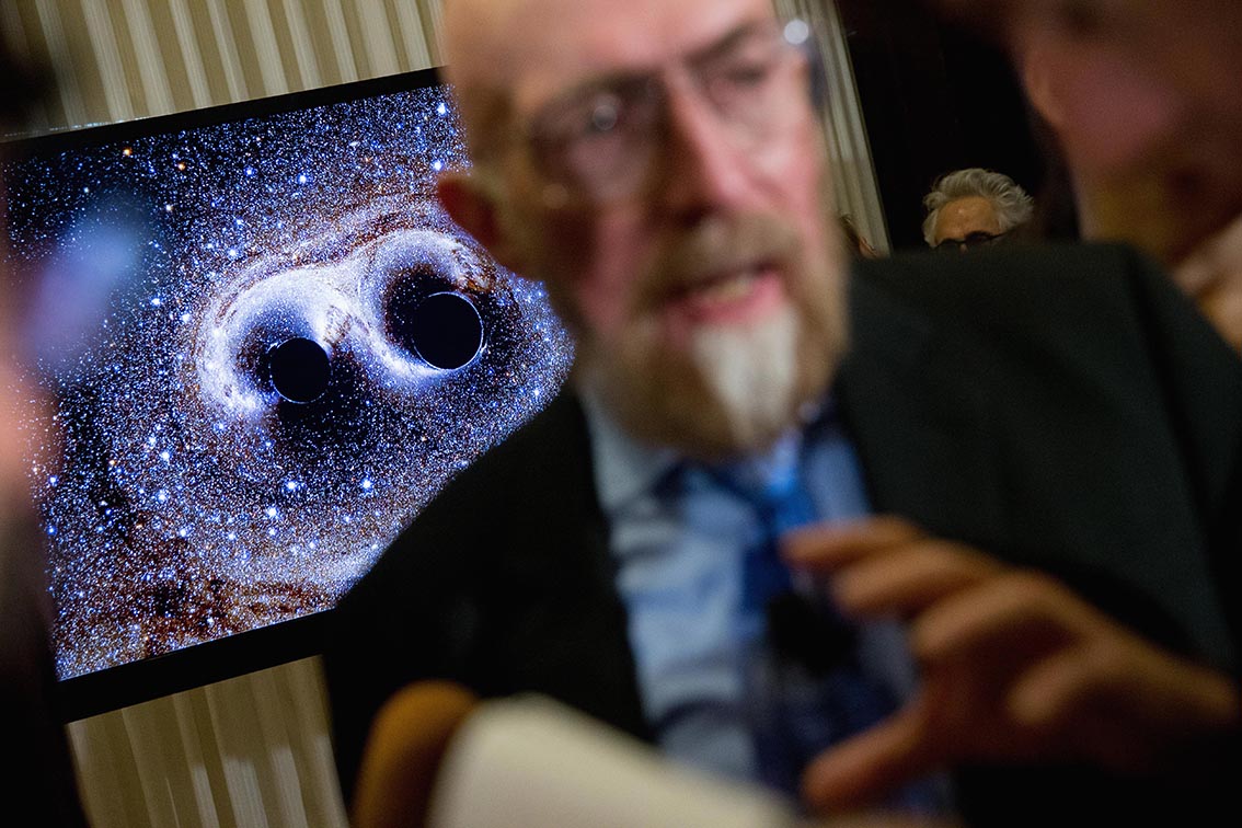2016年2月11日,在美国首都华盛顿举行的新闻发布会上,显示屏展现出两个黑洞合并产生的引力波信号图像,基普•索恩站在显示屏前