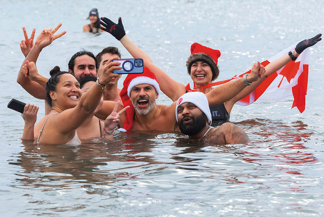 新年伊始,世界多地举办冬泳活动,迎接2025年的到来。图为1月1日,在加拿大多伦多安大略湖,人们在冬泳活动中自拍合影