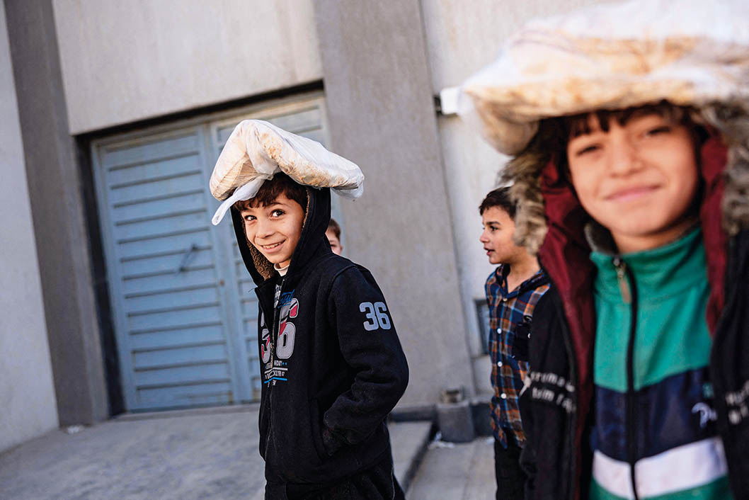 2024年12月15日,在叙利亚大马士革杜马镇,孩子们头顶刚刚购买的大饼