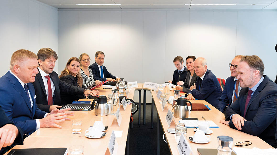 1月9日,在比利时布鲁塞尔,斯洛伐克总理菲佐(左一)与欧盟能源专员丹·约根森(右一)举行会谈。