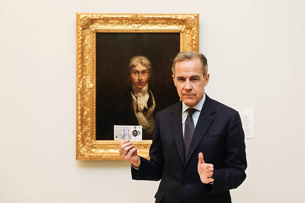 2020年2月20日,在英国伦敦,时任英格兰银行行长马克·卡尼在泰特美术馆的威廉·透纳画像前展示面值20英镑的新版钞票