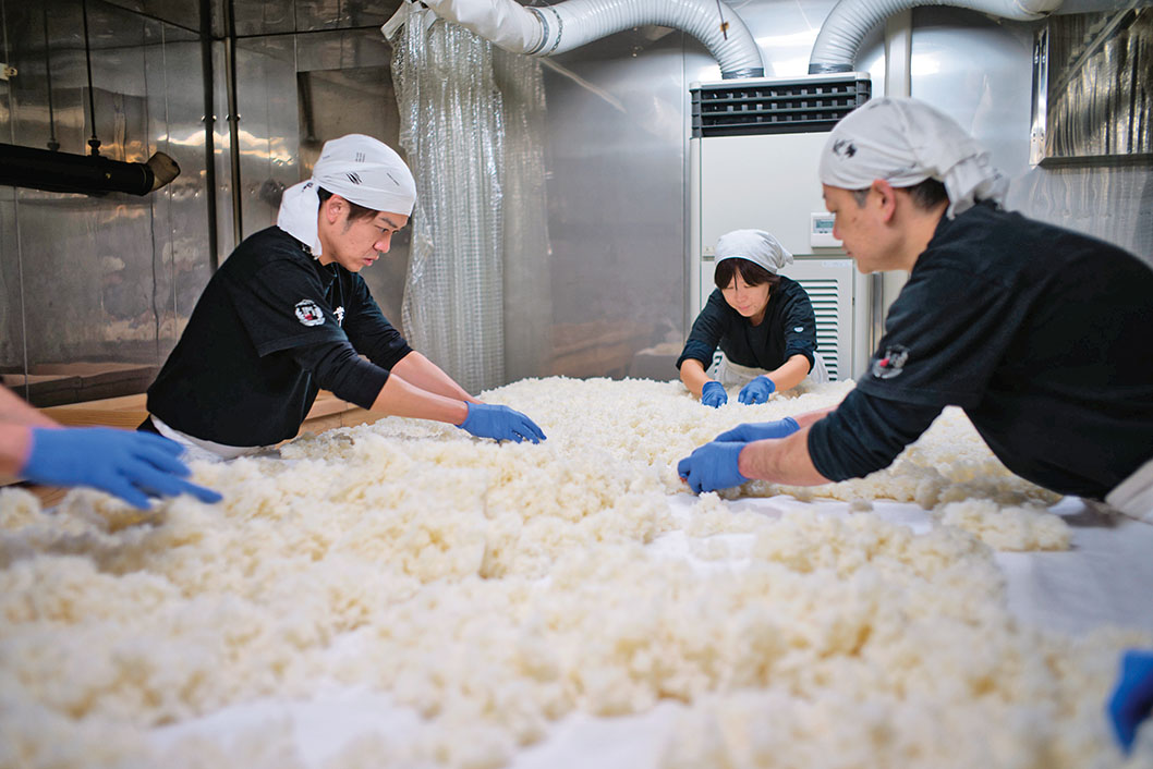 2024年12月17日,在日本福井县常山酒厂,工人门将撒好米麹菌的蒸米平铺在培养间内