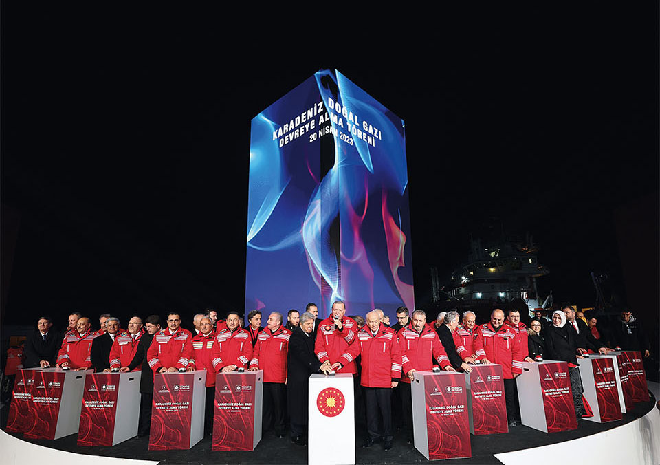2023年4月20日,土耳其总统埃尔多安(中)在菲利约斯港参加黑海天然气输气庆典