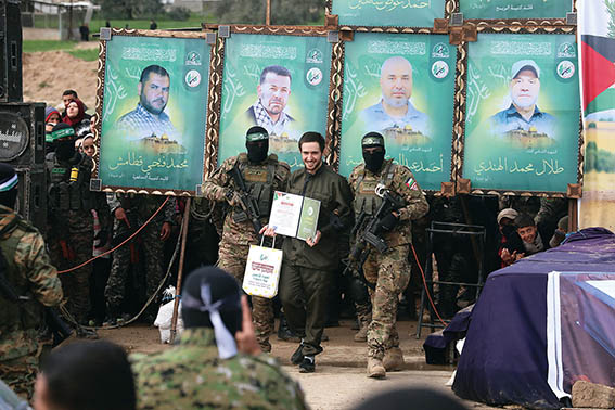 这2月22日在加沙地带中部努赛赖特难民营拍摄的以色列被扣押人员移交现场