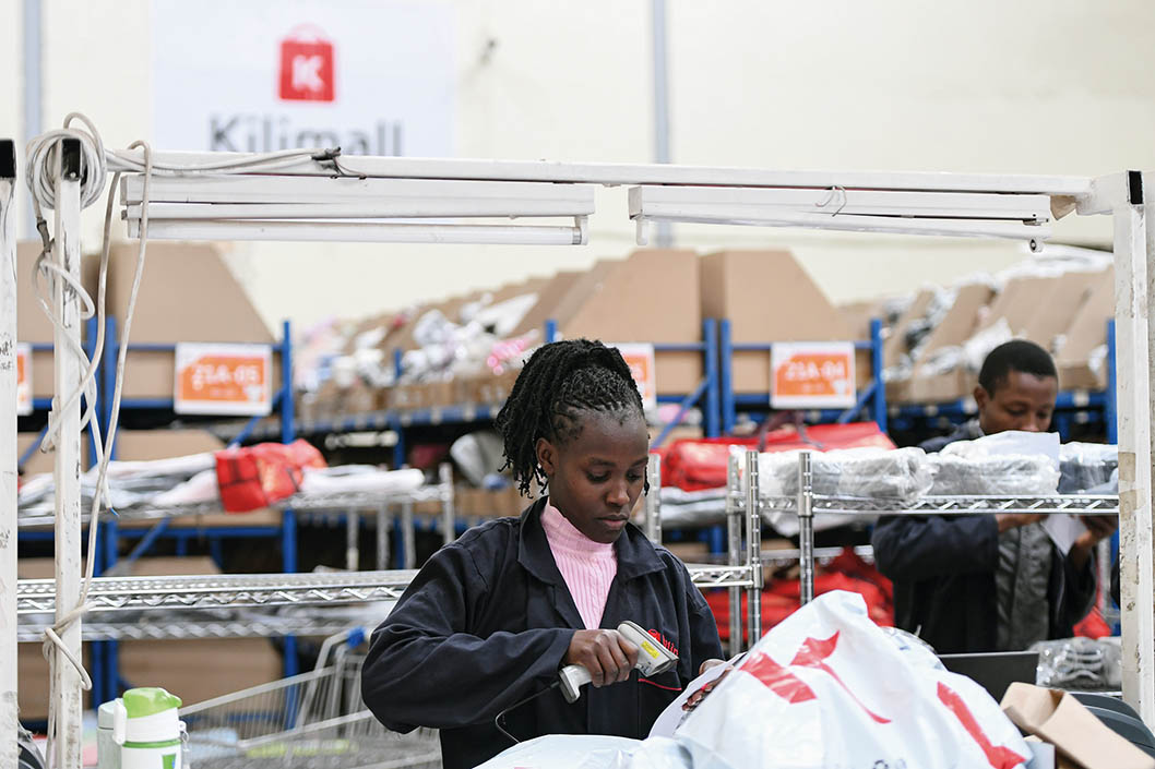 2023年7月28日,在肯尼亚姆洛隆戈,电商平台Kilimall 的员工在仓库内分拣货物