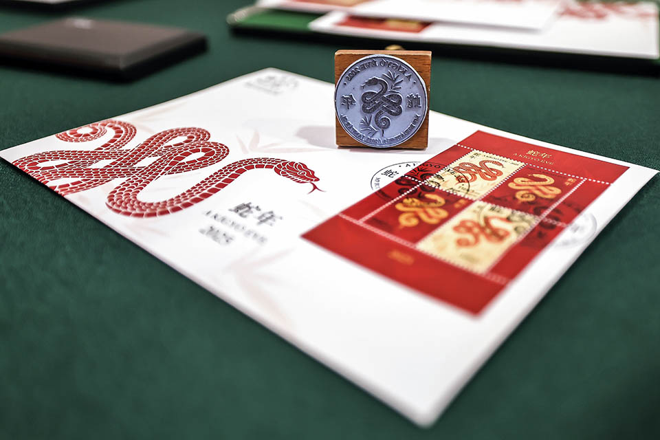 这是1月21日在匈牙利布达佩斯拍摄的中国农历蛇年生肖邮票首日封和纪念戳