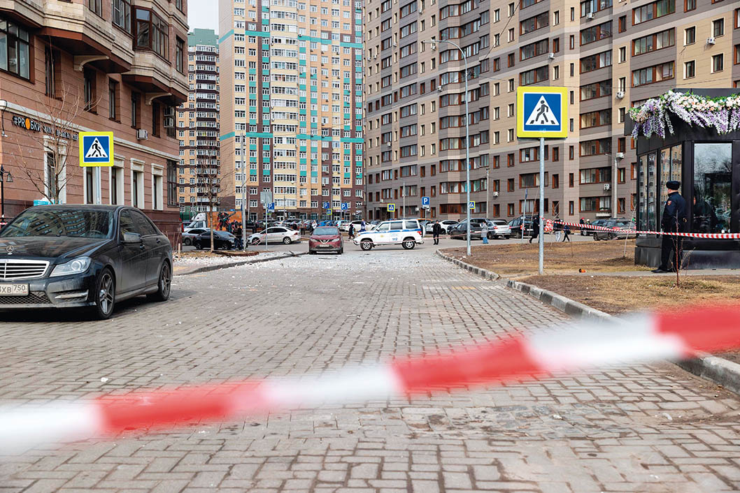 3月11日,俄罗斯遭遇今年以来最大规模的无人机袭击。图为在俄罗斯莫斯科州东南部,碎片散落在受损住宅楼旁