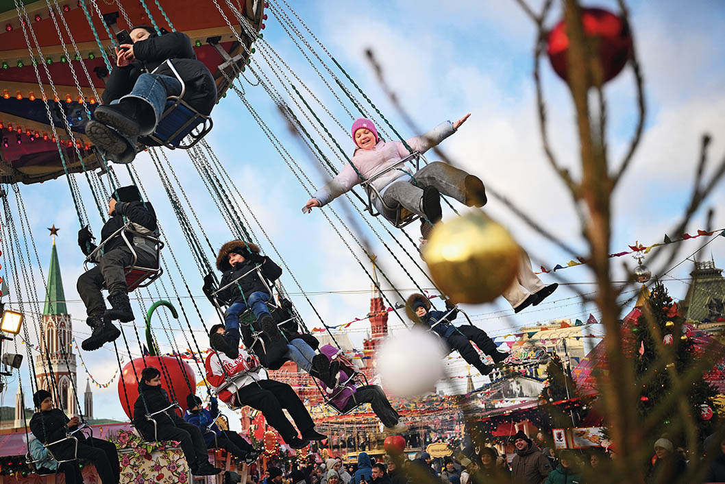 1月9日,人们在俄罗斯莫斯科红场乘坐游艺设施