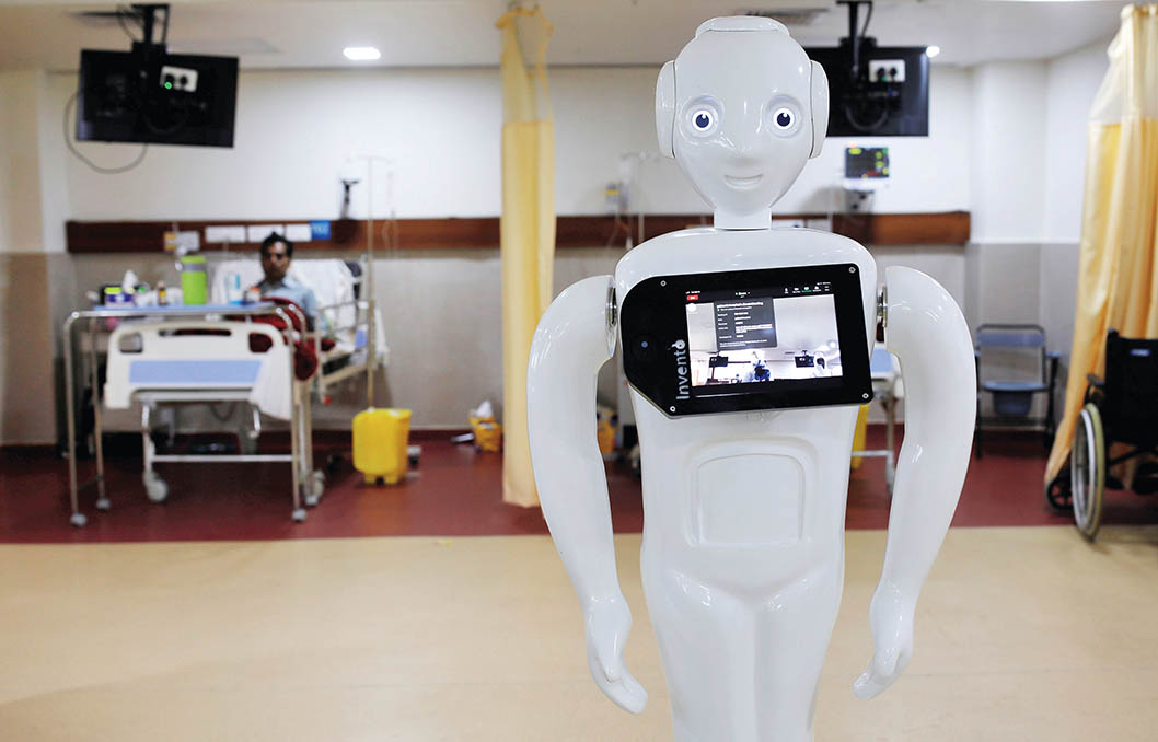 2020年9月15日,印度诺伊达一家医院利用机器人让新冠患者和家人沟通