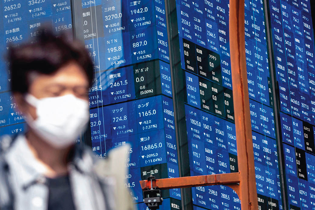 4月7日,行人经过日本东京的一处电子股指显示屏。因投资者担忧美国“对等关税”导致全球经济衰退,日本东京股市7日全线下跌