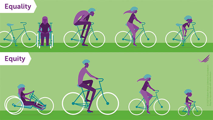 美国罗伯特·伍德·约翰逊基金会推广了一幅漫画,试图对这一问题进行解释。在漫画中,男人、女人、孩子和残疾人同样获得了一辆标准尺寸的自行车,女人可以全速前进,男人必须努力蹬车,孩子的脚踩不到踏板,而残疾人坐在轮椅上望着自行车不知所措。这幅漫画生动展示了美国提供的所谓“平等”背后的不公。表面上,所有人获得了一样的机会,但结果却明显不公平。只有当获得符合各自需求的不同尺寸、甚至特殊用途的自行车,漫画中的人才可能实现同样的行驶速度。但美国社会恰恰无法做到这一点。