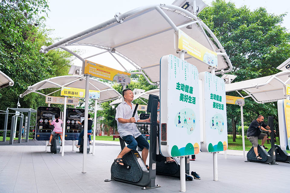 2022年8月8日,在广东省深圳市莲花山公园的室外智能健身房,市民群众使用免费的智能设施乐享健身运动