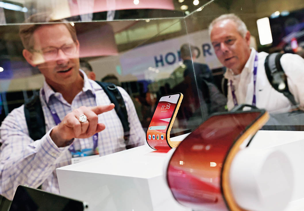 2024年2月27日,在西班牙巴塞罗那举行的2024年世界移动通信大会上,人们在联想展台参观摩托罗拉可弯曲智能手机