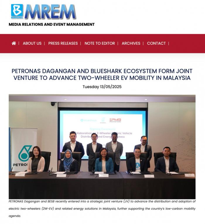 2025年5月9日,鲨湾科技马来西亚子公司蓝鲨生态系统有限公司(Blueshark Ecosystem Sdn. Bhd.,以下简称“BESB”)与东南亚石油巨头马来西亚国家石油贸易公司(PETRONAS Dagangan Berhad,以下简称“Petronas”)在吉隆坡正式签署投资协议,并宣布成立战略合资公司——蓝鲨马来西亚有限公司(Blueshark Malaysia Sdn. Bhd.,以下简称“BMSB”),共同推进新能源摩托车及能源补给解决方案在马来西亚的普及。此次合作标志着双方自2022年建立战略伙伴关系以来的全面升级。通过整合Petronas覆盖全马的加油站网络与BESB的创新技术优势,加速实现马来西亚国家能源转型(NETR)目标。