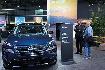 4月16日,在美国纽约举行的 2025 年纽约国际车展上,参观者在日产汽车展位前交流