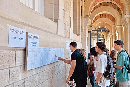 2022年7月5日,在法国巴黎伏尔泰中学,学生查看高中毕业会考成绩。当日是法国高中毕业会考成绩公布的日子,学生将凭会考成绩申请大学