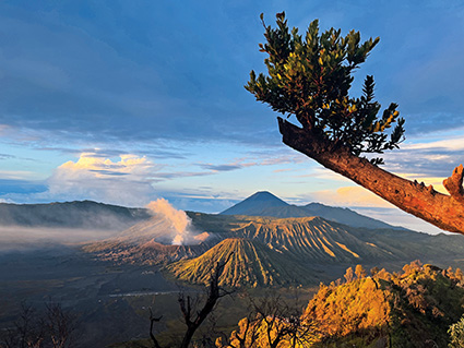 星空相伴,一个半小时很快过去,我们顺利在日出前抵达观景台。黑暗中,众人期待的第一缕阳光出现,天空从隐隐发白到泛着红光再到神秘莫测,太阳巧妙地绕过山谷上方的云海徐徐升起,将黑夜的寒冷驱散。雀跃的人群透过观景台的树木,和远处的火山群遥相呼应着,构成一组美轮美奂的摄影作品。