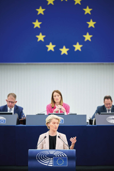 4月1日,欧盟委员会主席冯德莱恩在法国斯特拉斯堡举行的欧洲议会全会上讲话
