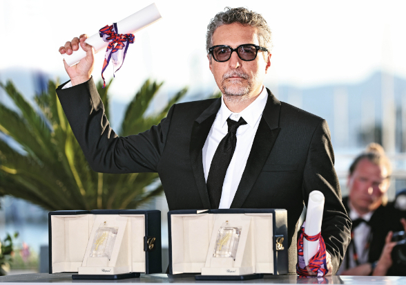 5月24日,在法国南部小城戛纳,巴西导演小克莱贝·门东萨出席颁奖典礼后的拍照式