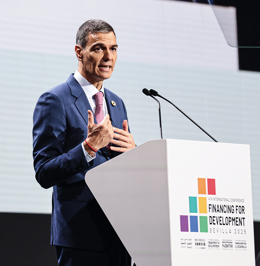 6月30日,在西班牙塞维利亚,西班牙首相桑切斯在联合国第四次发展筹资问题国际会议开幕式上致辞