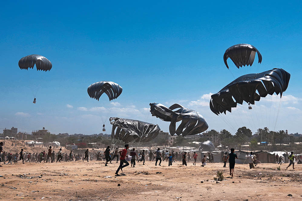 8月4日,在加沙地带中部的扎韦达,巴勒斯坦人涌向空投地点,领取人道主义援助物资