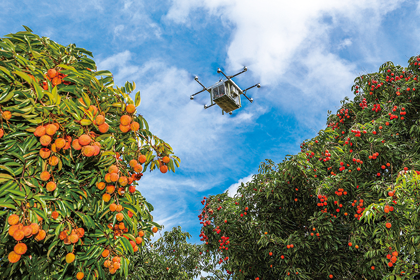 6月28日,在广州市从化区天人山水荔枝园,物流无人机运输刚刚采摘的荔枝