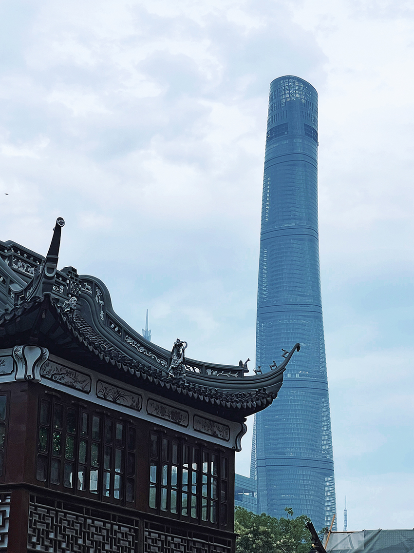 6月19日拍摄的上海豫园商圈内的江南传统建筑(前),与上海浦东陆家嘴的“中国第一高楼”上海中心大厦(后)相互映衬。88 年前,因地处上海“南市难民区”内,豫园等一批江南传统建筑在抗战烽火中得到了一定保护