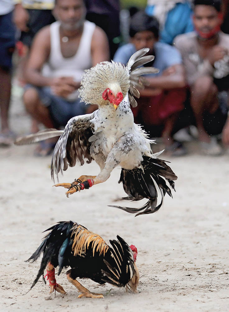 2020 年 9 月 7 日,两只公鸡在印度加尔各答郊外的纳格达村里参加当地一年一度的斗鸡比赛