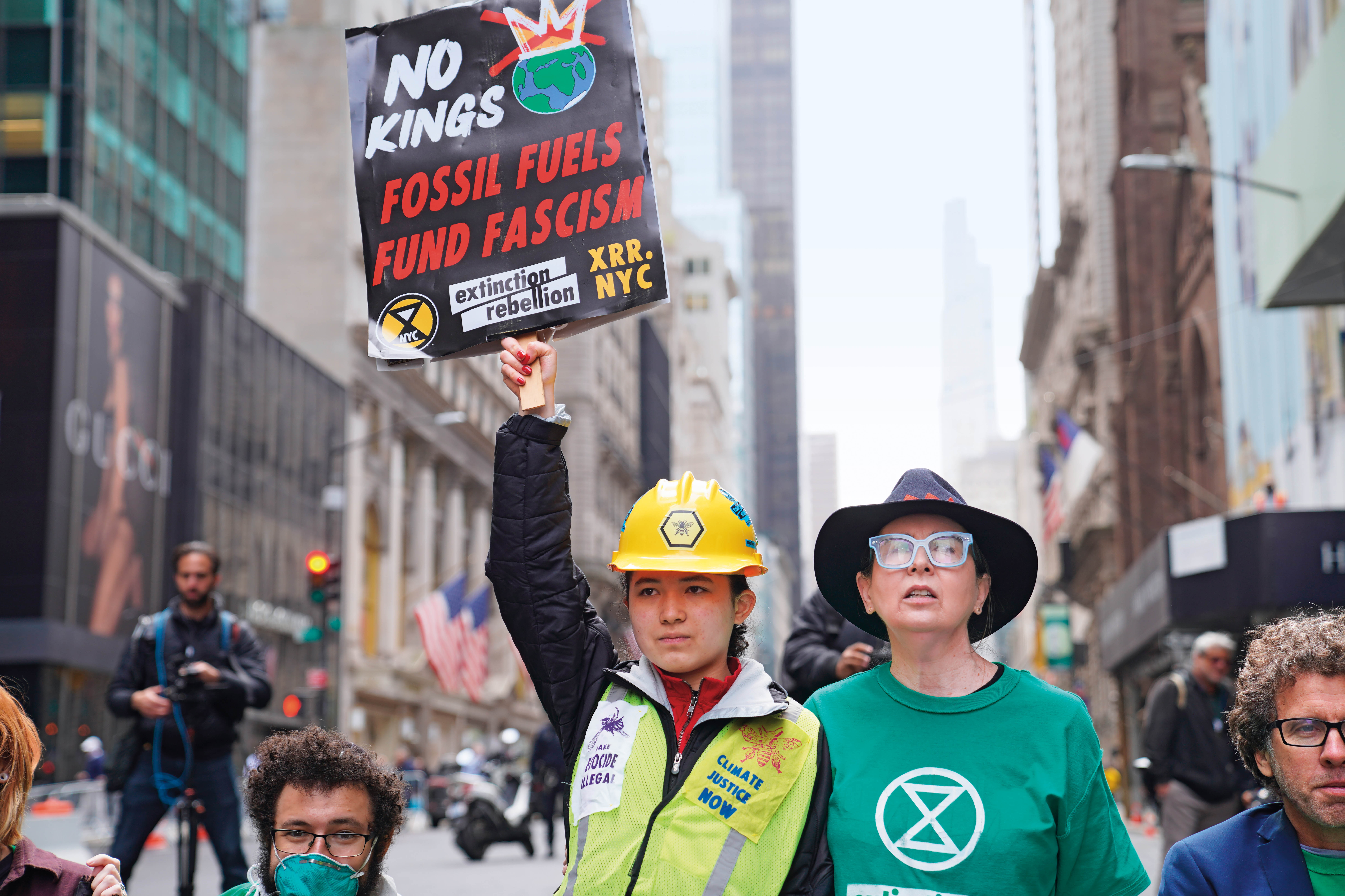 4 月 22 日是世界地球日,民众在美国纽约曼哈顿举行集会抗议美国政府的气候、环境、能源等政策,呼吁人们珍爱地球,保护环境。