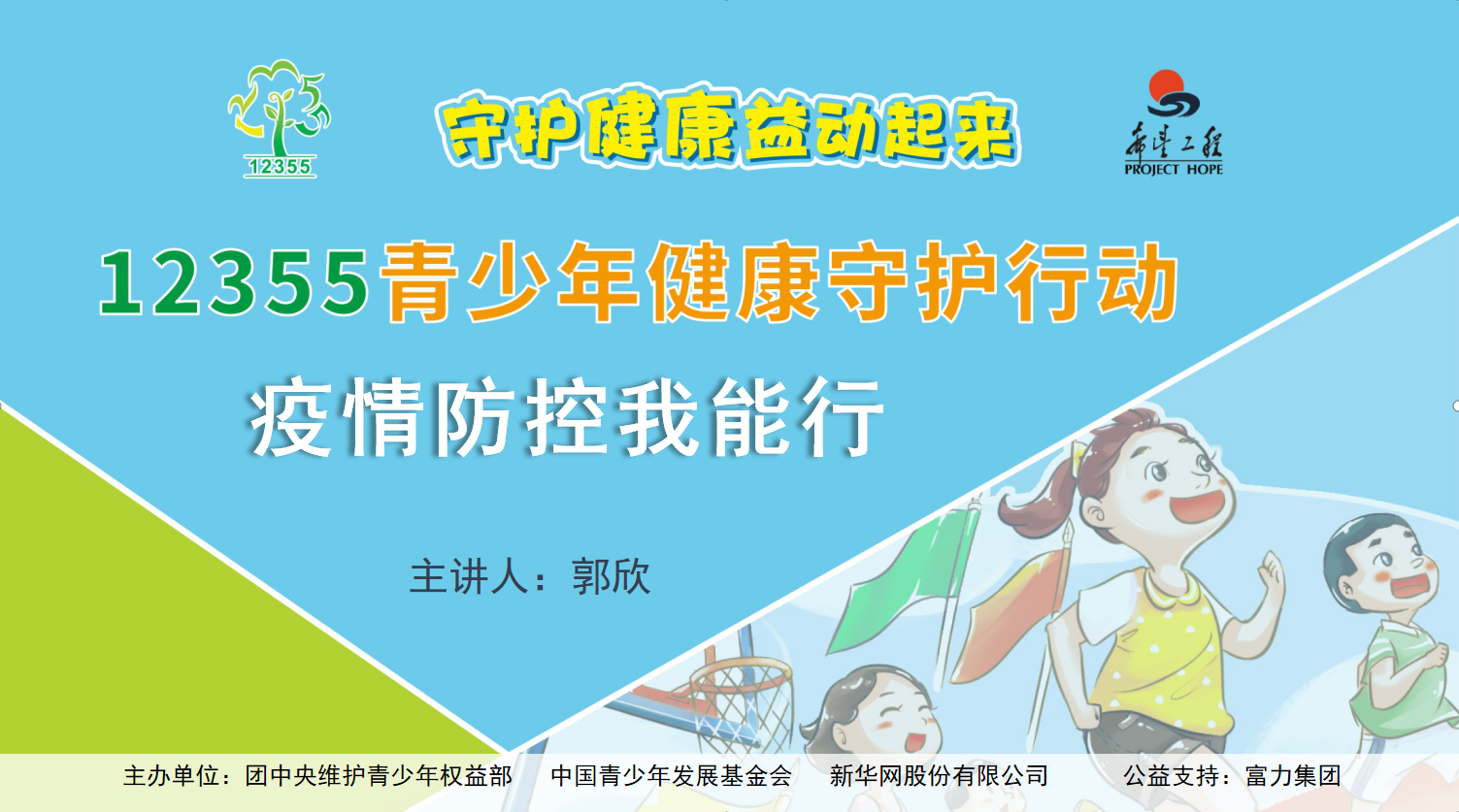 近日,由团中央维护青少年权益部、中国青少年发展基金会、新华网计划实施的“守护健康,益动起来——12355青少年健康守护行动”启动。该行动依托全国20个12355青少年服务台,为城乡中小学提供包括互动式培训、体验式素质拓展、专业慕课、心理测评和咨询等身心健康服务体系。该项目由富力集团捐赠提供公益支持资金。配合该行动,新华网公益频道“公益讲堂”栏目特别推出“守护健康,益动起来——12355青少年健康守护行动”系列公益课程。本期邀请北京市疾病预防控制中心学校卫生所所长郭欣和大家分享“疫情防控我能行”。