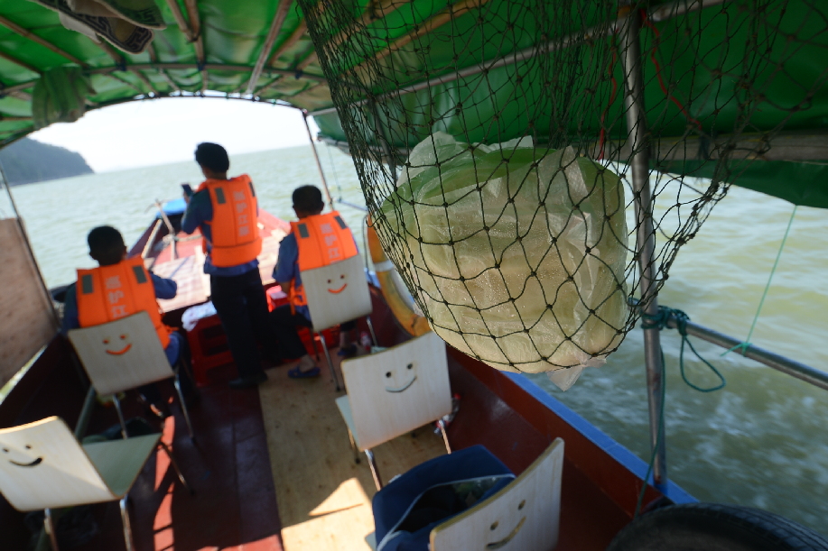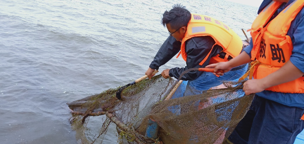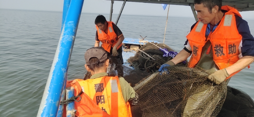 每天早8时,队员分两组出船巡护,清理一切可能威胁江豚安全的异物,观察并记录江豚活动。“渔网、垃圾、偷捕者布下的地笼都可能对江豚造成致命伤害,汛期时一天可以清运两三百公斤的湖面垃圾。”队长蒋礼义说。船上常备着药箱和软垫,用于救助搁浅或受伤的江豚。碰上水面能见度低的天气,工作难度大,一次巡护就要花上大半天。