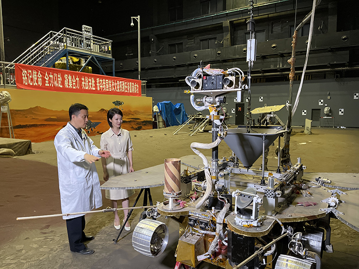 火星探测器总设计师孙泽洲(左)在火星试验场实地介绍“祝融号”火星车。(BTV供图)
