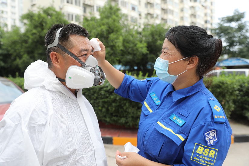 疫情期间执行居民小区消杀任务间隙,同是蓝天救援队队员的妻子为其擦拭汗水。