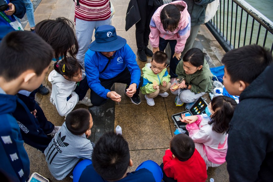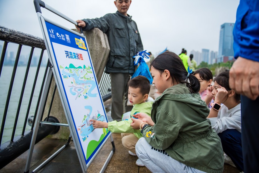 湘江之畔,孩子们热烈讨论起什么是“破坏水生态的行为”:往河水里扔垃圾、往江里排污水、违法挖沙采石……7岁的妞妞补充:“还有乱捕鱼!”