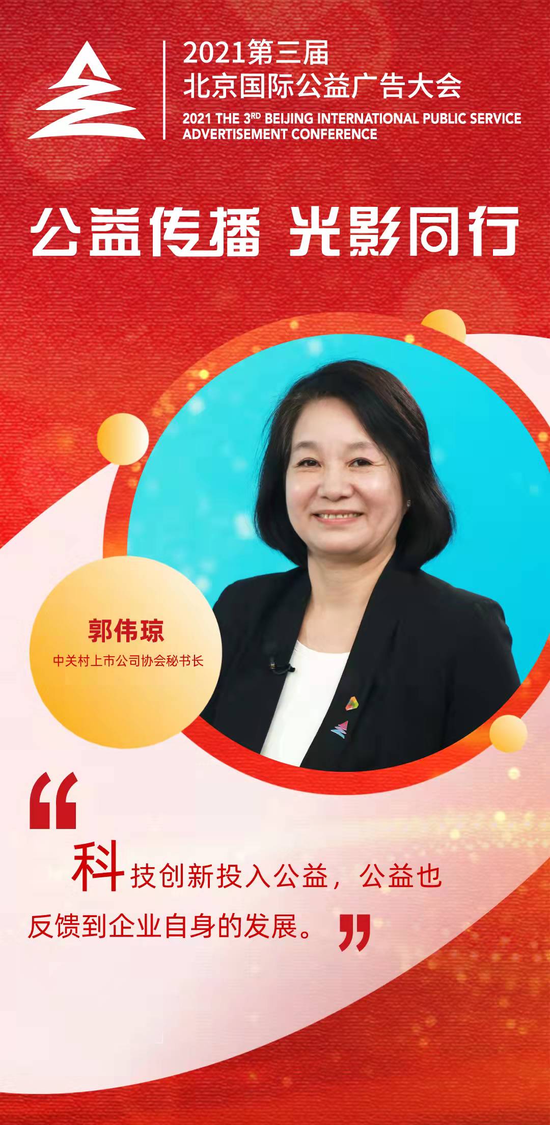 “公益传播,光影同行。”由国家广播电视总局、北京市人民政府指导,中共北京市委宣传部、北京市广播电视局主办的2021第三届北京国际公益广告大会于12月8日——10日以“线上+”方式举办。大会旨在聚焦新视听高质量发展和提升国际传播能力,唱响主旋律、传播正能量,打造具有国际影响力的品牌活动。中关村上市公司协会秘书长郭伟琼 在大会举办期间接受新华网访谈,就科技创新与公益传播与网友分享交流。
