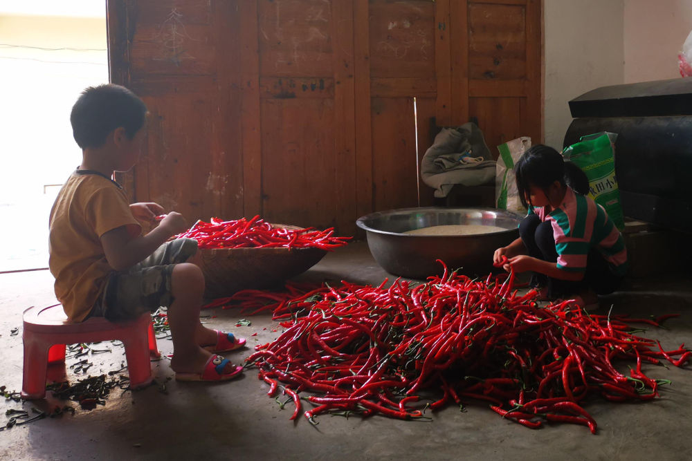 2020年暑假,罗梦琪和弟弟在捡辣椒。(柏露供图)