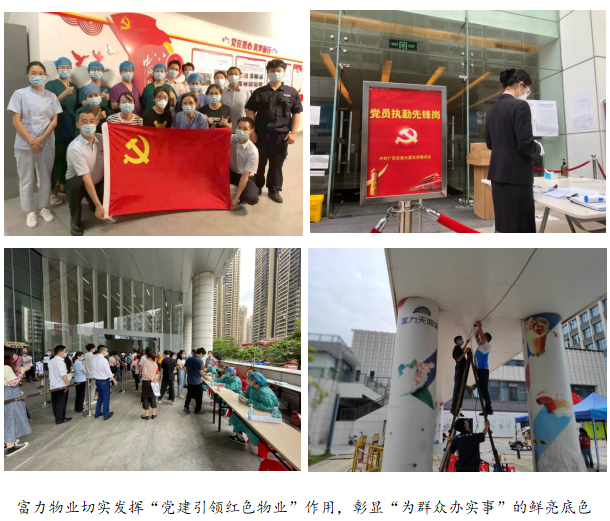 富力物业在广州市有30个住宅项目,15个写字楼项目,为应对中高风险区域全民核酸检测工作,富力物业积极紧密配合政府、医护人员全面联动、严密开展核酸检测工作,切实发挥“党建引领红色物业”作用,彰显出物业人“为群众办实事”的鲜亮底色。