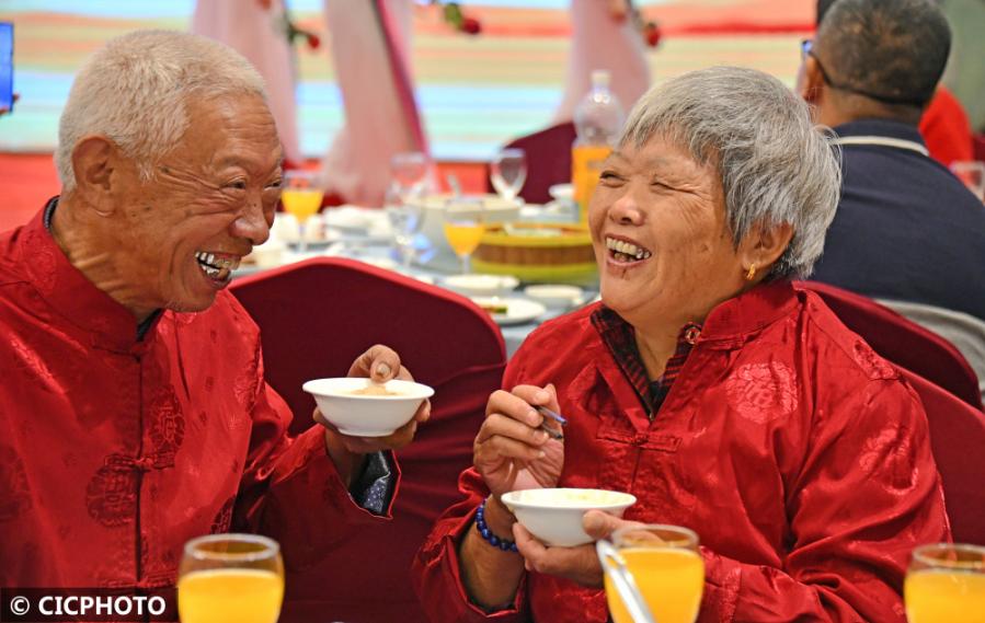 ↑2021年10月12日,浙江省台州市仙居县阳光义工协会在东岭安福山庄举办“情系最美夕阳 金婚纪念婚礼”公益活动,金婚老人王光荣、张珠凤夫妇开心地品尝爱心午餐。CICPHOTO/王华斌 摄