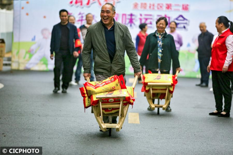↑2021年10月14日,在江西萍乡市经济技术开发区金陵社区举办的老年人趣味运动会上,老人们在参加推独轮车比赛。CICPHOTO/李桂东 摄