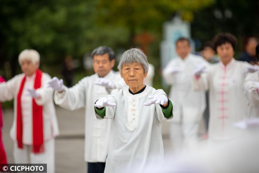 ↑2021年10月10日,河北省邢台市广宗县举办“喜迎重阳 太极有约”活动,近百名太极拳爱好者在石佛寺公园参加太极拳展演。CICPHOTO/候志营 摄