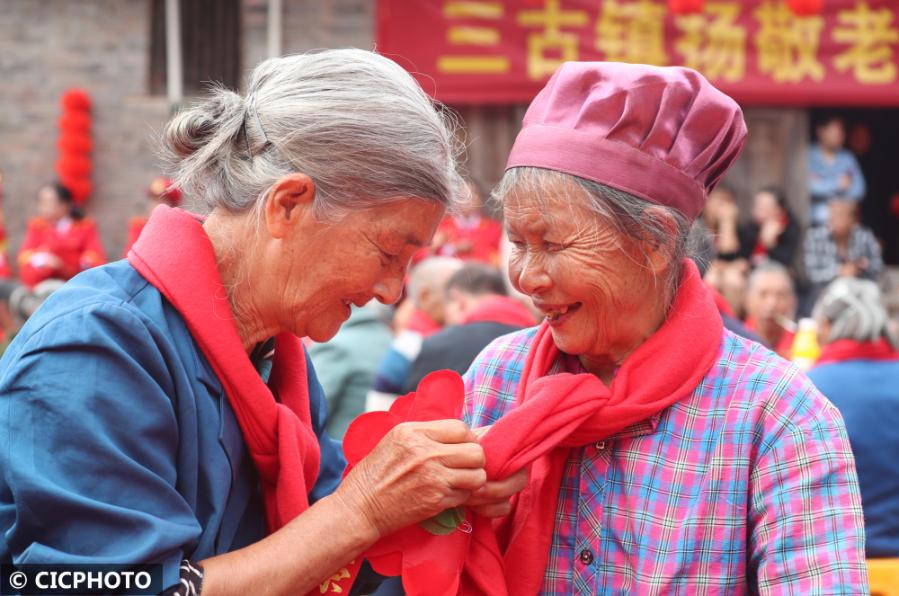 ↑2021年10月12日,四川省广安市邻水县三古镇在古院落游家大院举办“尊老敬老 欢度重阳”主题活动,两位老人相互佩戴红围巾。CICPHOTO/邱海鹰 摄