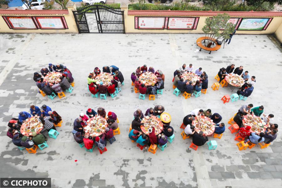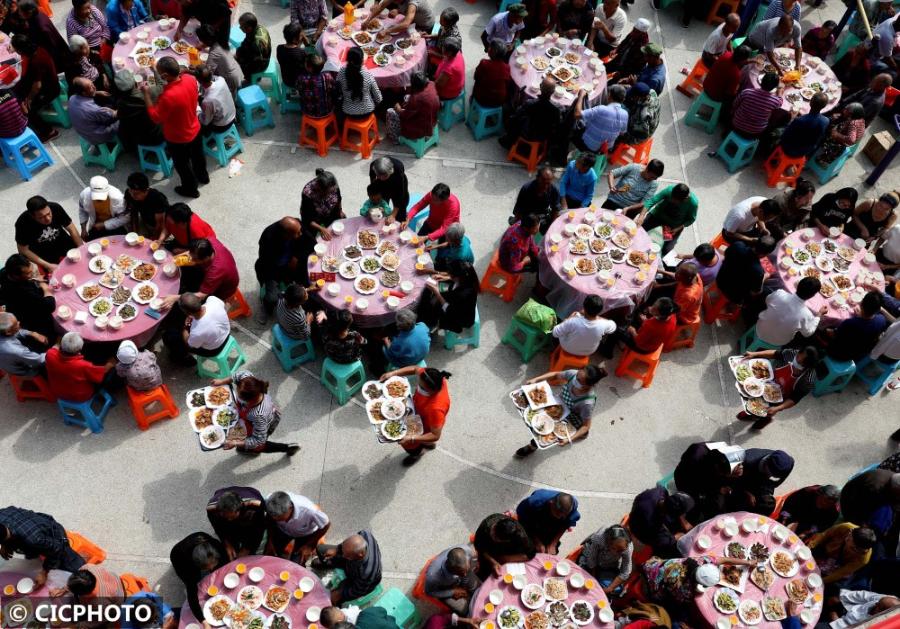 ↑2021年10月9日,在四川省达州市达川区双庙镇魏塘坡村举办的“父老白雪染双鬓 游子重阳寄深情”主题活动中,老人们在吃坝坝宴,感受在外儿女的孝敬。CICPHOTO/曾猛 摄
