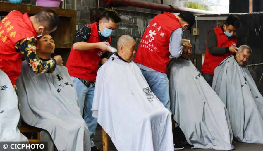 ↑2021年10月11日,重庆市酉阳土家族苗族自治县龙潭镇商会组织志愿者到龙潭敬老院看望慰问老人,并为老人义务理发。龙潭敬老院现有40名老人,来自该镇各村低保户,年龄在62—87岁。酉阳龙潭商会志愿者们除了节假日上门慰问老人外,平时定期来帮老人们义务理发、打扫房间。CICPHOTO/陈碧生 摄