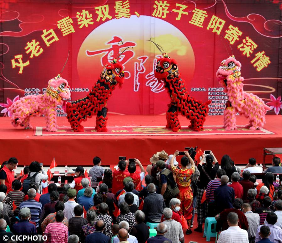 ↑2021年10月9日,在四川省达州市达川区双庙镇魏塘坡村举办的“父老白雪染双鬓 游子重阳寄深情”主题活动中,村民在观看传统舞狮表演。CICPHOTO/曾猛 摄
