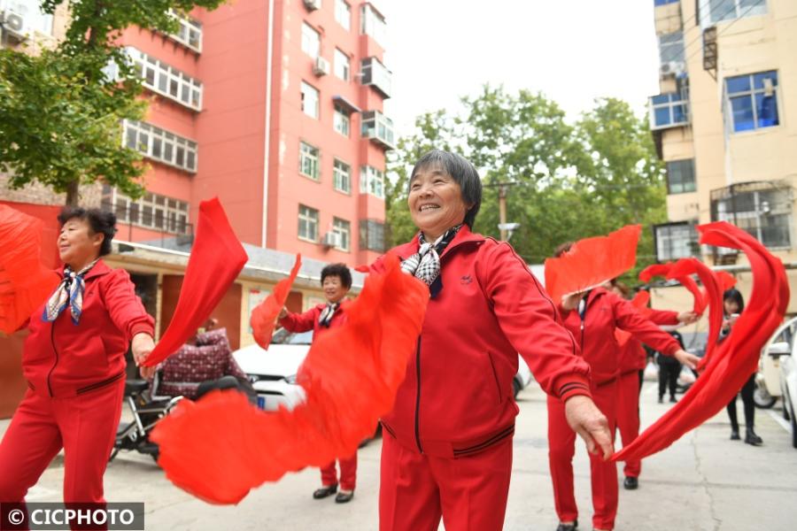 ↑2021年10月12日,在河北省邯郸市丛台区柳林桥街道东庄社区组织的重阳节活动中,老人们在跳舞。CICPHOTO/胡清华 摄