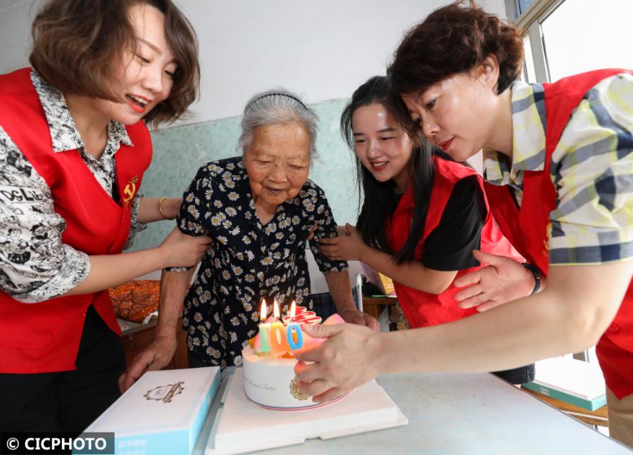 ↑2021年10月11日,浙江省舟山市定海区昌国街道虎山社区,志愿者们为百岁老人叶士英祝寿。CICPHOTO/张磊 摄