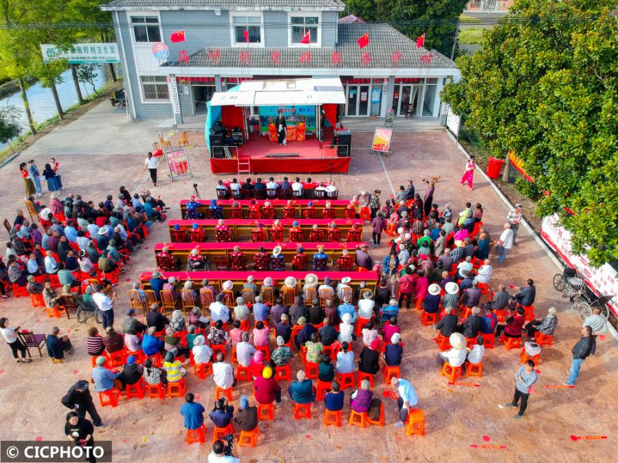 ↑2021年10月12日,在江苏省如皋市石庄镇海圩村举办的“幸福人生 欢乐重阳”主题活动中,志愿者为该村80岁以上老人表演戏曲节目。CICPHOTO/徐慧 摄
